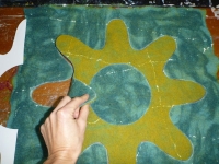 Die Schnipsel auf Steinschafwolle gelegt und eingefilzt.